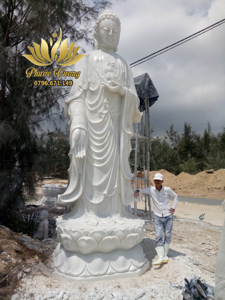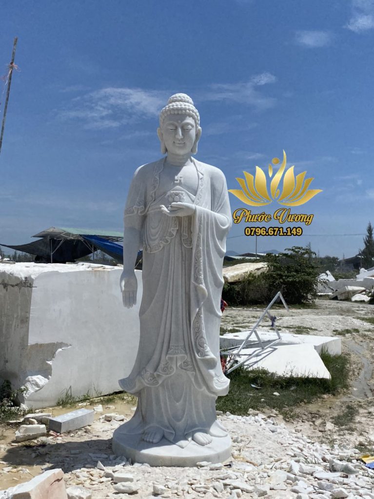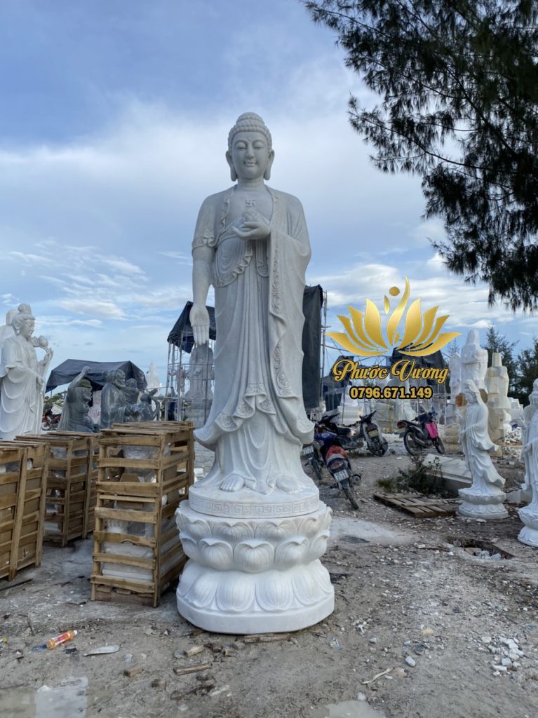 – Tượng Phật A Di Đà bằng đá đứng: Đây là hình ảnh Đức Phật A Di Đà đứng trên hoa sen lơ lửng giữa hư không. Phần bên dưới sẽ là bể cá sóng dậy chập chồng, mắt của Ngài sẽ nhìn xuống, tay mặt đưa ngang vai, tay trái duỗi xuống để sẵn sàng cứu giúp ai đó.